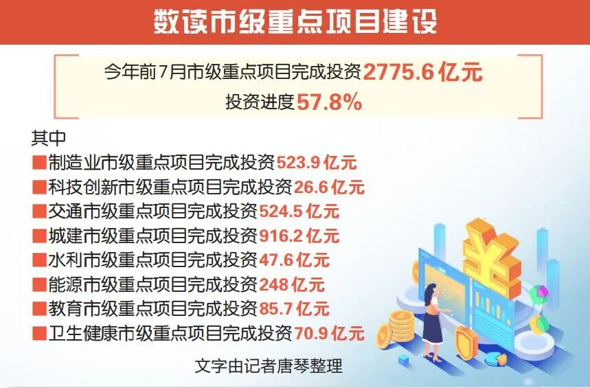 8月的重庆热浪翻滚,市级重点项目建设同样“热”力十足!近日,位于两江新区鸳鸯街道园博园东侧的重庆市青少年活动中心传来好消息,即将在9月正式投用!该项目以“五彩剪纸,山水共园”为设计理念,是重庆首个全钢结构装配式公共建筑,也是目前重庆规模较大的青少年校外教育综合体。重大项目不仅牵系民生福祉,更是经济社会发展的“牛鼻子”。今年以来,重庆坚持项目为王,全力以赴抓项目、促投资、稳增长,为经济社会高质量发展注入强劲动能。市发展改革委相关负责人透露,今年前7月市级重点项目完成投资2775.6亿元,投资进度(占年度计划投资比例)57.8%。在两江新区礼嘉片区,山外山血液净化产业园项目正加速刷新进度条。该项目总投资约20亿元,占地约120亩,总建筑面积约20万平方米。其中,项目一期总建筑面积约11.5万平方米,总投资8亿元,目前已完成主体工程建设,预计2025年底建成投产;项目二期计划2026年1月开工,目前正在开展方案设计,计划2026年建成投用。“今年,项目年度计划投资1.5亿元,前7月完成投资1.2亿元,投资进度80%。”该项目相关负责人表示,项目建成后,可实现年产值约30亿元,新增就业岗位2000余个。该项目只是重庆狠抓重大项目,以科技创新引领新质生产力发展,加速建设现代化产业体系的一个缩影。数据显示,前7个月,重庆制造业、科技创新加速集聚成势,市级重点项目完成投资550.5亿元。制造业市级重点项目完成投资523.9亿元。具体来看,智能网联新能源汽车市级重点项目完成投资39亿元,恒伟林汽车零部件生产基地项目7月开工建设,永川汽车精密配件生产项目厂房和办公楼均已完工;新一代电子信息制造业市级重点项目完成投资105.9亿元,重庆奕能碳化硅模组生产基地项目完成总工程量的58%,OPPO(重庆)智能生态科技园二期项目完成总工程量的37%;先进材料市级重点项目完成投资88.9亿元,涪陵华峰年产138万吨功能性新材料一体化产业链项目子项PTMEG氨纶产业链深化项目土建主体结构完工,华峰年产45万吨高端铝板带箔项目厂房桩基础完成75%。科技创新市级重点项目完成投资26.6亿元,其中,国合通测先进射线技术与应用研究中心项目进入桩基础施工阶段,中子科技氘氚科学装置建设及中子科技产业创新项目完成总工程量的42%。作为贯通重庆东西向的城轨快线,轨道交通15号线的进展备受关注。目前,轨道交通15号线一期正全面加快土建、装饰装修及系统设备安装施工,2025年计划投资37.5亿元,1—7月已完成投资29.9亿元、投资进度79.7%。轨道交通15号线二期正在全面开展主体结构施工,2025年计划投资32亿元,1—7月完成投资26.9亿元、投资进度84%。轨道交通15号线预计2026年开通试运营,可实现西永、两江、龙盛三大中心组团的直接联络,由西向东连接沙坪坝区、两江新区和渝北区。事实上,以重大项目建设为支点,加速城市建设提质增效,正是重庆大力撬动城市结构优化、动能转换、品质提升的关键一招。数据显示,前7个月,重庆城市基础设施市级重点项目稳步建设,交通、城建、水利、能源市级重点项目完成投资超过1700亿元。“内畅外联、四通八达”交通网络越织越密,交通市级重点项目完成投资524.5亿元。其中,铁路市级重点项目完成投资201.7亿元,高速公路市级重点项目完成投资245.5亿元。城市基础设施配套不断优化,城建市级重点项目完成投资916.2亿元。其中,轨道交通市级重点项目完成投资229.7亿元,城市路桥隧市级重点项目完成投资119.5亿元,产业园区建设市级重点项目完成投资115.5亿元。重庆水网加快构建,水利市级重点项目完成投资47.6亿元,其中,云阳幸福水库总体形象进度达到82%,巫溪凤凰水库开挖工程完成80%。多元化现代能源保障体系持续夯实,能源市级重点项目完成投资248亿元。其中,涪陵白涛燃机热电联产项目进入设备调试阶段,渝西页岩气开发配套管网工程足虎线、临港线B段完工。作为国家区域医疗中心,华中科技大学同济医学院附属协和医院重庆医院(以下简称武汉协和重庆医院)于2023年1月开工建设。截至2025年6月,武汉协和重庆医院主体工程已通过竣工验收,正开展信息化招标及医疗设备采购论证工作,今年计划投资的2亿元已在前7月全部完成。该项目是大型三级甲等公立综合医院,由重庆市、两江新区主建,武汉协和医院主营,项目用地面积210亩,总建筑面积约39.1万平方米,床位1500张,总投资43亿元,预计将于今年底建成投用。武汉协和医院作为输出医院,将全面复制协和医院1个“双一流”学科、10个国家重点(培育)学科和25个国家临床重点专科建设项目,逐步设置33个临床科室、8个辅助科室,配备医务人员2550名,平移112项新技术、新项目、新材料,引进百余名医学专家,满足当地群众就近就医、享受高水平医疗服务的需求。近年来,重大项目正成为重庆靶向发力服务民生的支撑点。今年前7月,重庆民生市级重点项目稳步推进,教育和卫生健康市级重点项目投资进度均超过60%。比如,教育市级重点项目完成投资85.7亿元,其中,渝中金银湾小学内部装修完成75%,丰都观塔社区学校进入收尾阶段,九龙坡育才实验学校华岩分校基本完工。又如,卫生健康市级重点项目完成投资70.9亿元,其中,重庆市第四人民医院科学城院区一期室内装修工程基本完成,江北区人民医院新建项目内部装修工程完成80%。市发展改革委相关负责人表示,下一步,重庆