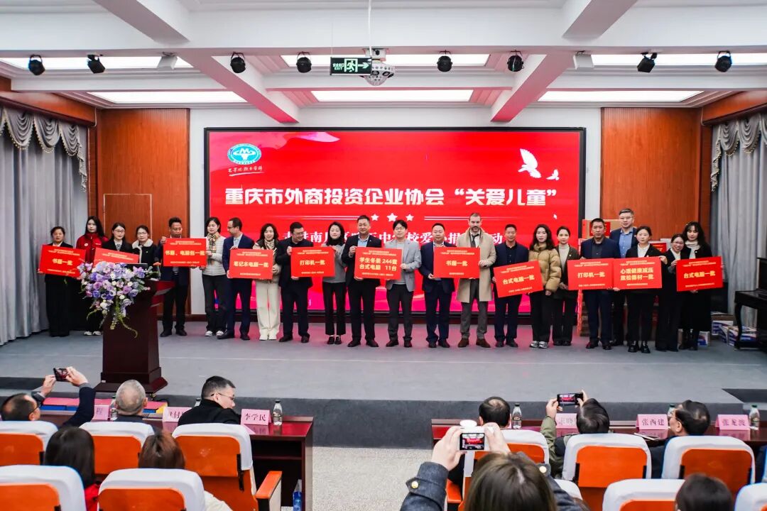 重庆市外商投资企业协会“关爱儿童”外企公益捐赠活动自2012 年启动以来,已连续走过13个年头,累计吸引318家外资企业参与,足迹遍布我市18所偏远地区学校,为6840名师生送去温暖关怀,累计捐赠物资价值达187.65 万元。本次鸣玉中学捐赠活动,得到SK海力士、康明斯、奥特斯、耀中国际学校、中粮可口可乐、EF教育、特斯拉、卡洛哈、欧拓、市外资协会、众程外协人力等11家单位的热心捐赠,以及市慈善总会、惠普、迪卡侬的鼎力支持。活动募集到全校学生冬季校服、台式电脑、笔记本电脑、打印机、情绪解压仪器、课外书籍等价值15万元物资,将切实助力学校改善教学与学习环境。